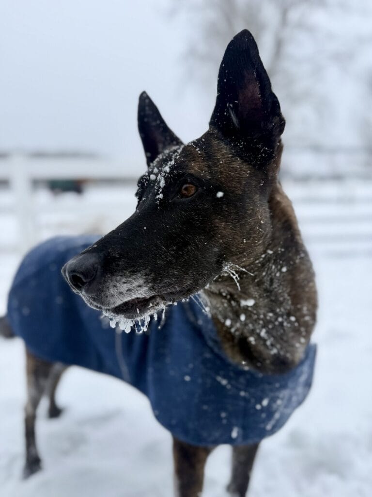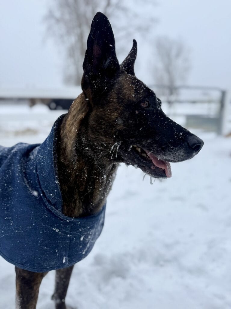 Now after years of early mornings, long days in the desert heat, and the kind of work that most wouldn’t even dare to do, K9 Gama has more than earned her retirement. These days, you’ll find her ruling the roost on what we lovingly call the mini ranch, where she has fully embraced her role as the boss dog. And trust us, she takes that title seriously. According to Gama, there is never enough time to play in the snow.