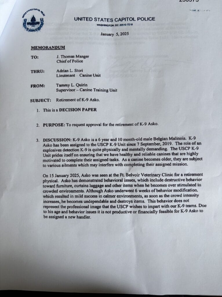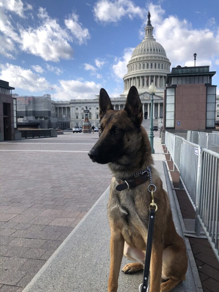 Asko served as an Explosive Detection K9 with Capitol Police from 2019-2025. He was tasked with protecting Members of Congress, Presidents, Vice Presidents, Heads of State and countless International VIP’s as well as providing security for every concert and major event on the grounds of the Capitol during this time. Asko was known as the “Unofficial Emotional Support Dog” by many and loved to visit fellow Officers.