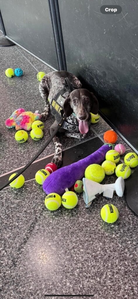 Bonna is a 10 years old German Short-haired Pointer from Boston Logan Airport. Bonna is an explosive detection canine graduated from TSA Canine Training Center in Lackland Airforce Base, San Antonio Texas in May 2017. Bonna has been to New Orleans airport (MSY) to help with ESSENSE festival. Bonna was also deployed to Philadelphia airport (PHL) to help with the refugee special operations. Bonna loves training with all different agencies including FBI, ATF, CBP, MSP, ETC.