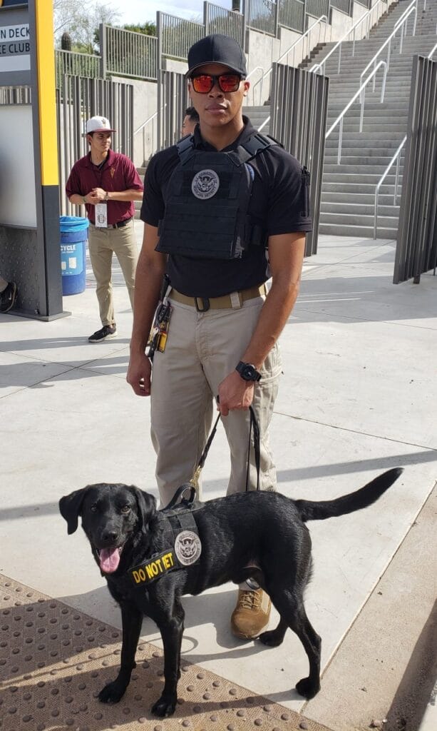 Bruce is a retired passenger screening explosives detection canine for TSA/DHS. He was assigned to his only handler, Ty Bilton, in June 2016. They graduated as a pair from the National Explosives Detection Canine Team Program at Lackland AFB, San Antonio, TX, in September 2016. During his career, Bruce worked regularly at Charlotte Douglas – CLT (2016-2017) and Phoenix Sky Harbor – PHX (2017-2021) airports. He also worked temporary duty assignments at Los Angeles – LAX and San Diego – SAN airports. Additionally, Bruce worked to supplement security measures at numerous ASU football games, and once with the Secret Service during a Presidential Campaign visit in 2020. Bruce loves hanging out with other dogs. He’s gentle and fun-loving. He enjoys playing fetch with anything “round” and “yellow”, from tennis balls to lemons. Bruce is always in the mood to savor a tasty treat, or receive a good petting!