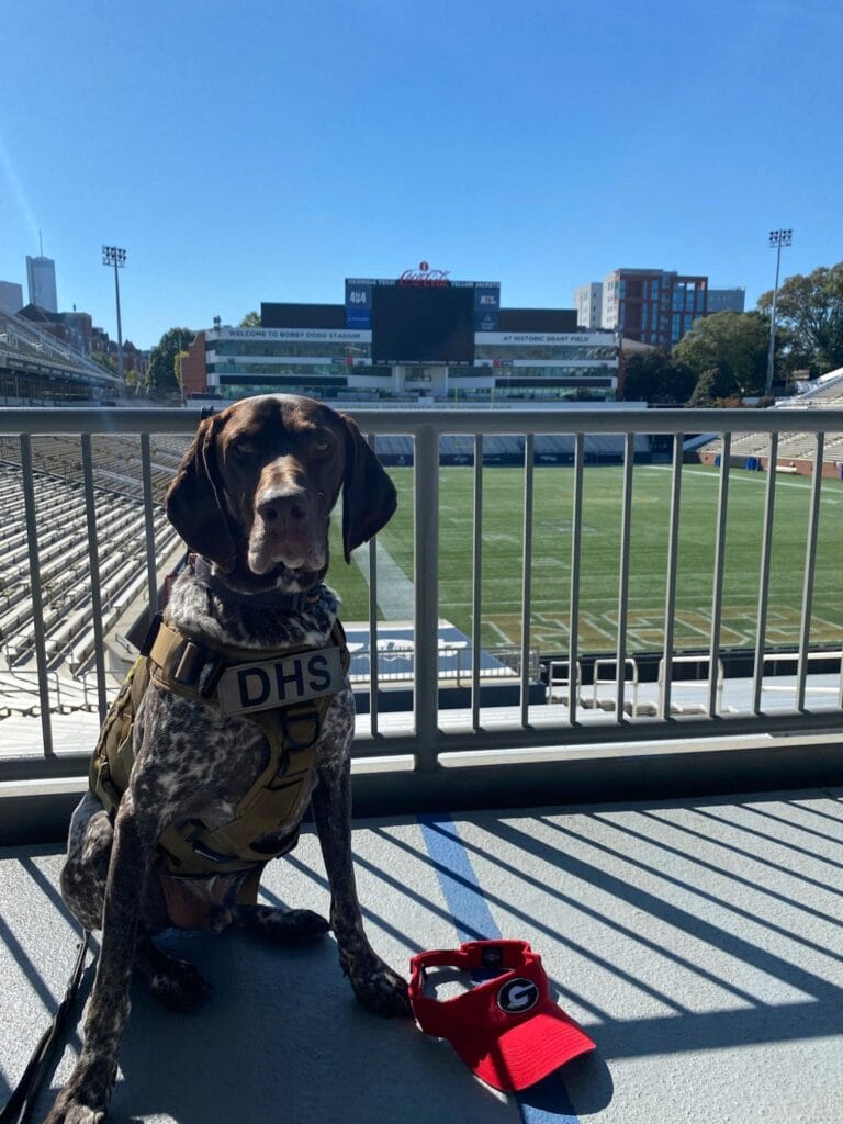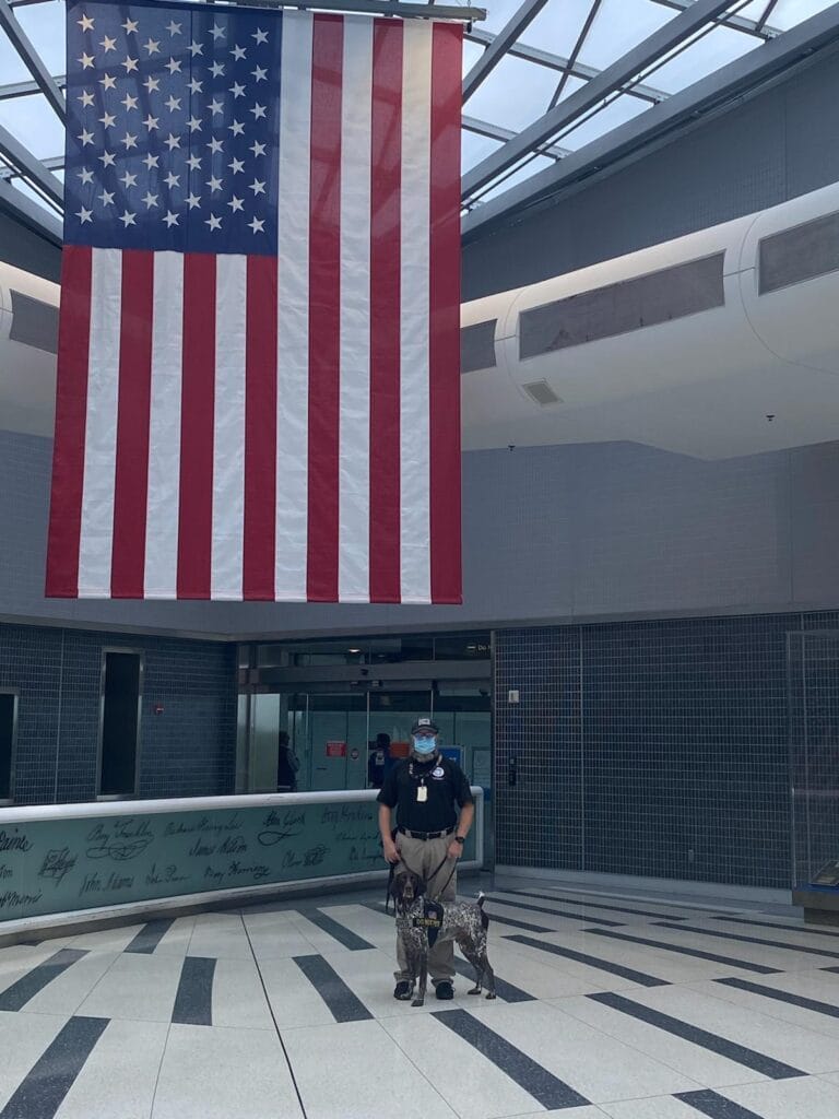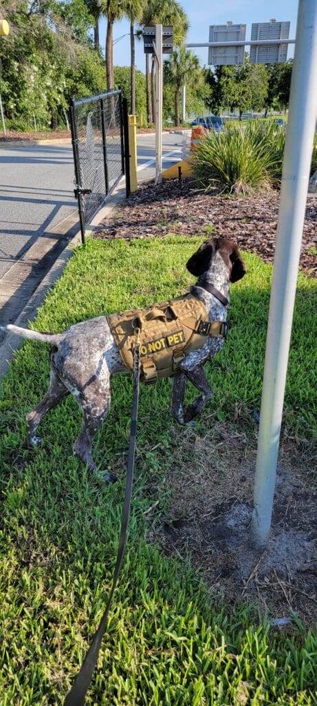 Caki is a high energy extremely devoted canine. Once he was on odor there was no stopping him to get to the source of origin. He is a great road warrior also. We have traveled to Charlotte, NC, and Orlando, Fl to support summer rushes. We have also traveled to cover special events such as Augusta, Ga to assist with The Master’s and to Philadelphia, PA in support of the arrival of Afghanistan Refugees. While his primary duty was Passenger Screening he would never pass the up the opportunity to stalk the occasional pigeon. In his downtime he still likes to burn off energy by going for long walks. When Caki has a hard day of work, he likes to lay down and stretch or find a favorite pillow to rest his head.