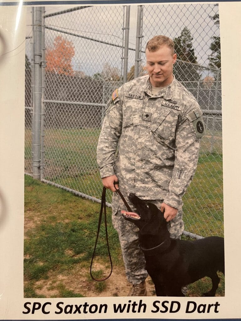 Specialized Search Dog (retired) Dart (T304) served in the active duty Army for 4 years. His time was cut short due to the SSD program being dismantled and dogs being retired. Dart was adopted by his handler, Raymond Saxton, and began his life at home with him, his now wife, and a Great Dane named Finn. The retirement did not stop Dart from wanting to work or remain active. During his service, Dart was stationed at Fort Polk, Louisiana and Fort Meade, Maryland. He deployed to Afghanistan in 2012 for a year long rotation working with the Special Operations community and finding over 30 IEDs and Caches. He performed numerous VIP missions for POTUS, VPOTUS, FLOTUS, SECDEF, and other high profile personnel from the DoD and State Department both stateside and overseas. Dart and his handler performed dozens of demonstrations to the public during national night out and large garrison events. He was recognized for his participation in Veterans Day events, building relationships with surrounding communities. Currently, Dart spends his time at home with his previous handler and his family, going to parks, travelling, and being the best dog anyone could ask for.