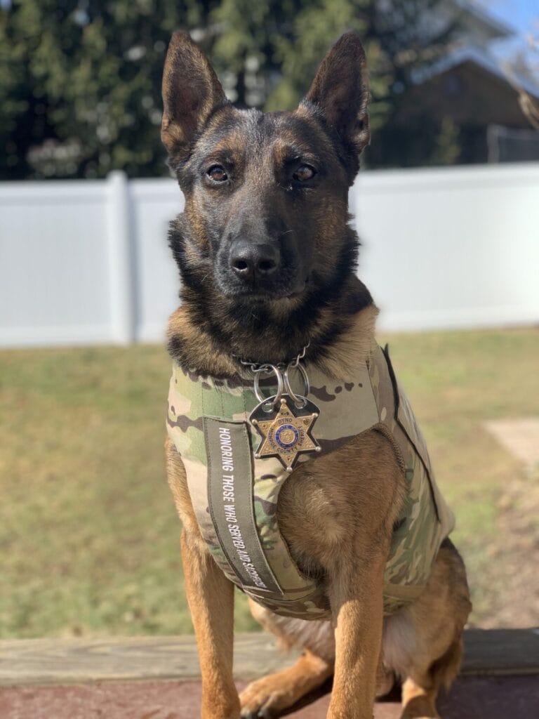 K9 Dyno is a male German Shepherd/Belgian Malinois mix imported from Hungary in 2018. K9 Dyno was imported to Shallow Creek Kennel in Pennsylvania before being purchased by the Monroe County Sheriff’s Office. K9 Dyno and his Handler, Deputy Bell, completed a 14 week patrol school and successfully passed the New York State DCJS K9 Certification which consists of Obedience, Tracking, Building Searches, Area Searches, and Criminal Apprehension. Dyno and Deputy Bell then completed a 6 week Nitrate course and completed another New York State DCJS Certification. Dyno has had been a part of numerous critical incidents and has assisted on hundreds of K9 jobs throughout Monroe County, assisting every law enforcement agency throughout the county over the course of his career. Dyno has had dozens of successful tracks, locating numerous missing persons and suspects. K9 Dyno has also located 6 firearms used in crimes, dozens of spent casings, and has apprehended six suspects through bites. K9 Dyno has also conducted numerous mass gathering and VIP searches at local colleges and universities as well as nitrate searches for the Buffalo Bills Training Camp, and the LPGA and PGA. Dyno has been an extremely successful and valued member of the Monroe County Sheriff’s K9 Unit and is currently enjoying his time in retirement.
