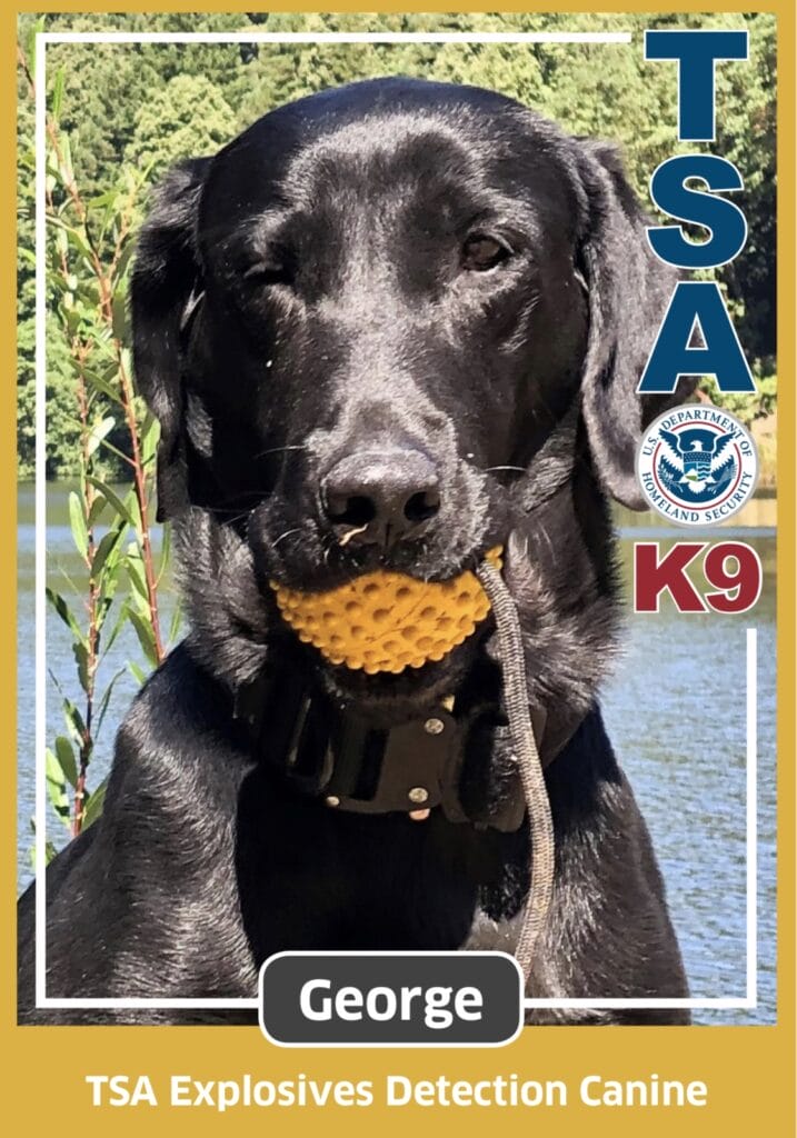 George’s full given name is Pretty Boy George (PBG) and spent his TSA career certified at SFO. Recently I changed agencies and was able to get him transferred with me, but unfortunately he had two seizures while I have been away on training. He was diagnosed with idiopathic seizures and has been medically retired. George loved to go to work and had a great work ethic, which helped me getting up at 0300 seeing his eagerness. George jumps up off all fours, for three things, work, fetch and food. He will now be able to enjoy being at home, where he can go swimming and play fetch. He is now allowed to pick up the bbq dropped on the floor.