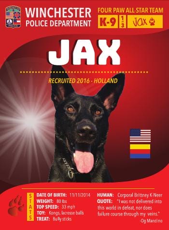 Canine Jax came to the Winchester Police Department in 2016 from Holland by way of Shallow Creek canine in PA. Canine Jax was green when purchased and was subsequently dual certified in narcotics and patrol. Jax worked the streets of Winchester along side his partner on midnight and second shift until he was retired in 2020. Jax was lovingly called “Ninja” by officers within the department because he was unusually quiet and tended to “stalk” potential apprehensions until they made the decision to run. Jax made countless drug busts in his career and was successful on a number of tracks and deployments for peaceful surrender.