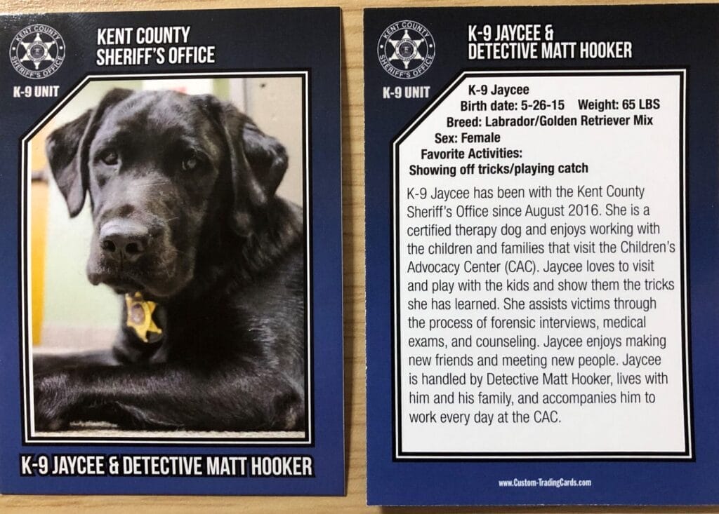 Canine Jaycee worked with the Kent County Sheriff’s Office from August 2016 until April 2021. She worked as a certified therapy dog loved working with the children and families that visited the children’s advocacy center (CAC.) Jaycee loved to visit and play with the kids show them the tricks that she learned. JC assisted victims of child sexual abuse through the process of forensic interviews medical exams and counseling. She was assigned to Detective Matt Hooker and full time to working with the victims at the CAC.