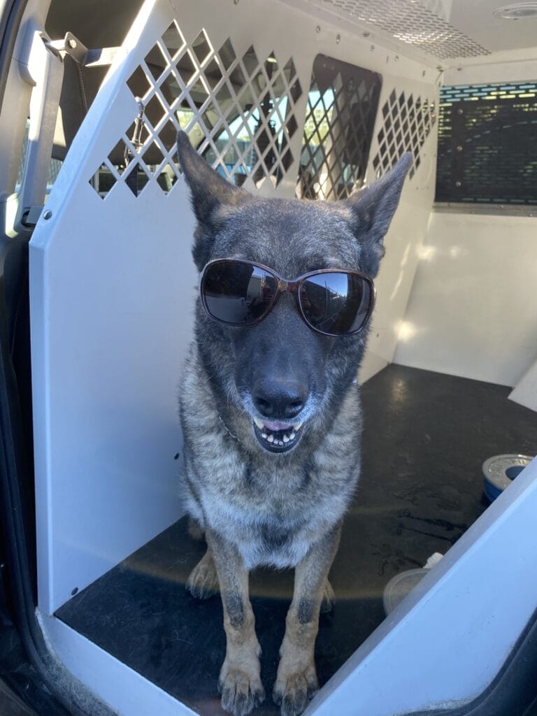Mischa is an 11 year old German Shepherd. She had a successful 10 year K9 career at the San Diego Harbor Police providing detection services for the San Diego International Airport and the surrounding Tidelands, and Seaport. Some of her day to day working activities included airport sweeps, cruise ship sweeps, dignitary sweeps, random searches Including cargo, and public visibility sweeps. Mischa was a fast and efficient searcher with an amazing nose. She loved working and especially liked doing K9 demonstrations for the kids. Mischa was a quirky working dog and sometimes a borderline Drama Queen. Whenever a new working K9 came onto scene, she would have to meet them, give them the “lick” of approval prior to her being okay with them working around her. In other words, she needed to be acknowledged and noticed!! She has a very loving demeanor and loves all the boys (men and boy doggos)! She greets everyone with gusto!! Mischa loves being around people, likes to be petted, nose scratches, and kisses. If you don’t pet her immediately, she will sit and stare at you, and believe me, she can win any staring contest. This could be a testament to her stubborn streak. Mischa has embraced the retirement life. She loves being lazy. I find her all over the house sleeping with her ball next to her or in her mouth. She loves the couch, her hooman’s bed, the dog bed, and laying by the front and back door looking outside. She also loves hanging outside on the back porch watching for lizzards. One thing Mischa misses in retirement, is going to work with her Hooman. She misses riding in the car and always being around someone. So on her Hooman’s day off she loves going on car rides and hanging out at dog friendly restaurants/breweries/parks, and camping. Mischa loves when the grandbabies come to visit. She follows them around waiting for snackoos to drop on the ground.