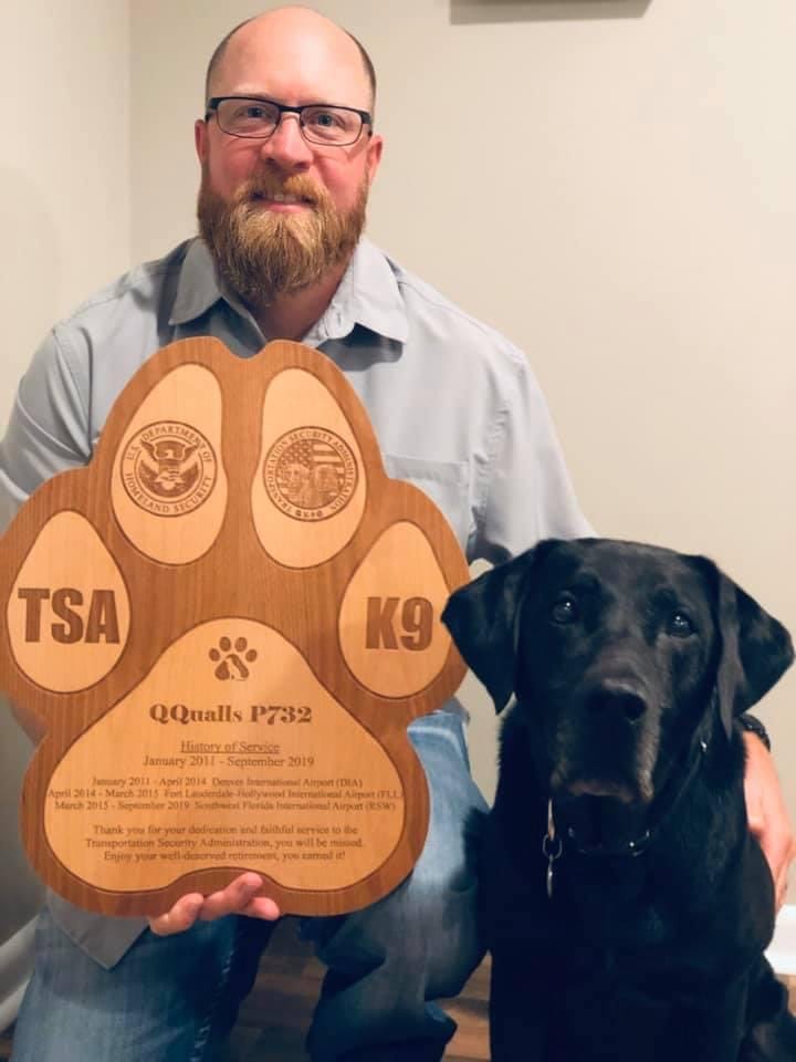 Qualls was bred at Lackland Air Force base as part of the post 9/11 puppy program. QQualls is named are a fallen soldier who died fighting in Operation Iraqi Freedom, Louis W. Qualls. QQualls served with The Department of Homeland Security for 8.5 years. He is now retired with his handler and family, he enjoys swimming in the pool, long walks and relaxing!