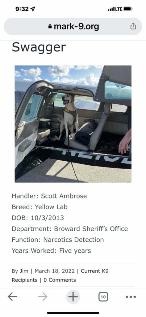 Swagger was a 2 years old yellow lab when she began working with me (Detective Scott Ambrose) at the Broward Sheriff’s Office in Fort Lauderdale, Florida. We were initially assigned to the major narcotics unit in 2015 and shortly thereafter to the interdiction unit. We worked at the Fort Lauderdale International Airport, Fort Lauderdale Executive Airport, UPS, FedEx and the USPS, as well as assisting the district offices and other speciality units in traffic stops and search warrants.