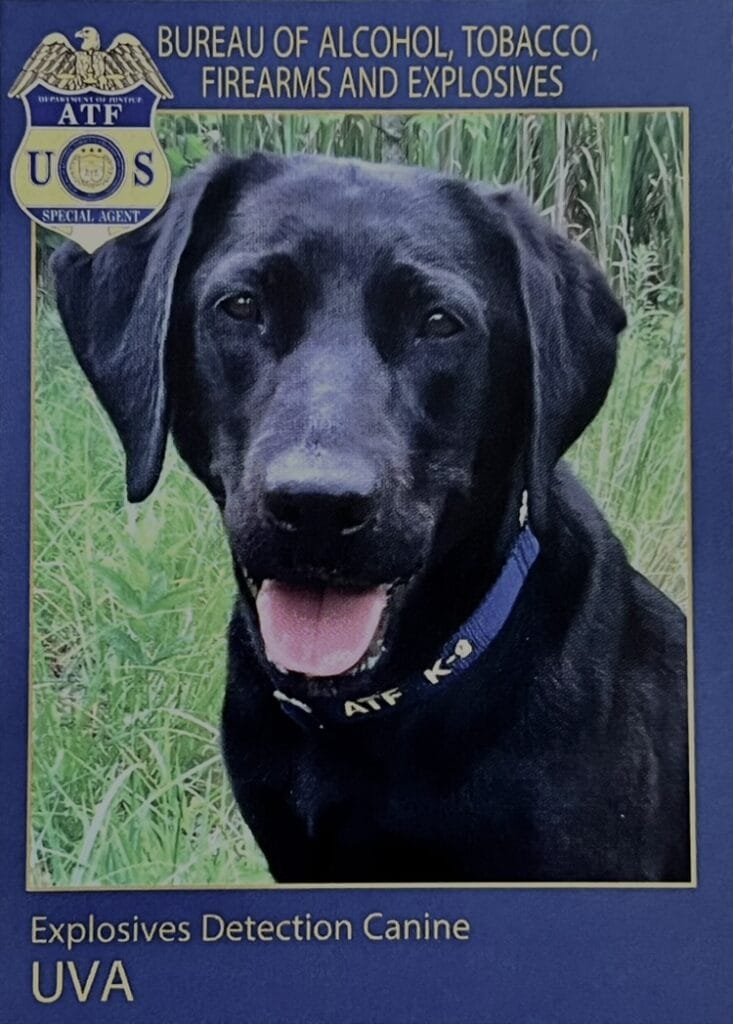 K-9 Uva proudly served her country as an ATF Explosives Detection K-9 in Washington D.C. from 2017-2020. She is trained to find bombs, guns, ammunition, and 19,000 different explosive compounds. As a Search Enhanced Evidence K-9 (S.E.E.K.) Uva is trained to deploy off leash to targets 200 yards away to search for explosive odor. Using a whistle, hand signals and a communication collar her handler is able to direct Uva’s work remotely. Uva has conducted hundreds of security sweeps, routine as well as for special events. She’s swept motorcades, venues and hotel rooms of many important politicians, dignitaries and celebrities. Uva had a working partnership with many local, State and Federal agencies such as State Department, U.S. Marshals Service, CIA, Fairfax County Bomb Squad, VA State Police and anyone who requested our assistance. Uva was utilized in search warrants, evidence searches, crime scene and post blast searches. K-9 Uva worked and lived with her family in the Washington D.C. area but deployed nationwide. At least once a week Uva was requested for a K-9 demo by the ATF HQ, Canine Training Center and Academy as well as other agencies, organizations, media and schools. She was extremely popular because of her sweet disposition and entertaining antics!